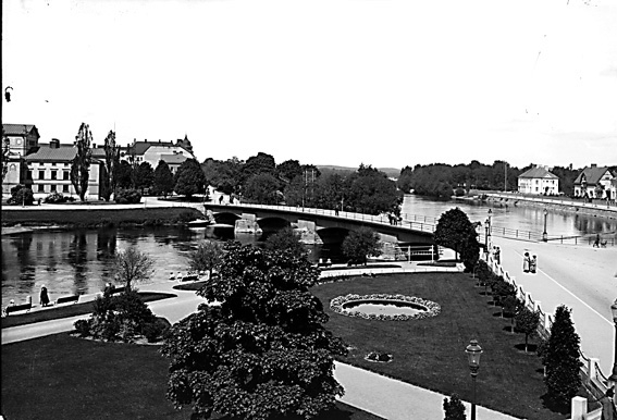 Stadsvy över Karlstad. Tingvallastaden med bron över till Klara med Karlstad teater till vänster och Sandgrundsudden till höger.