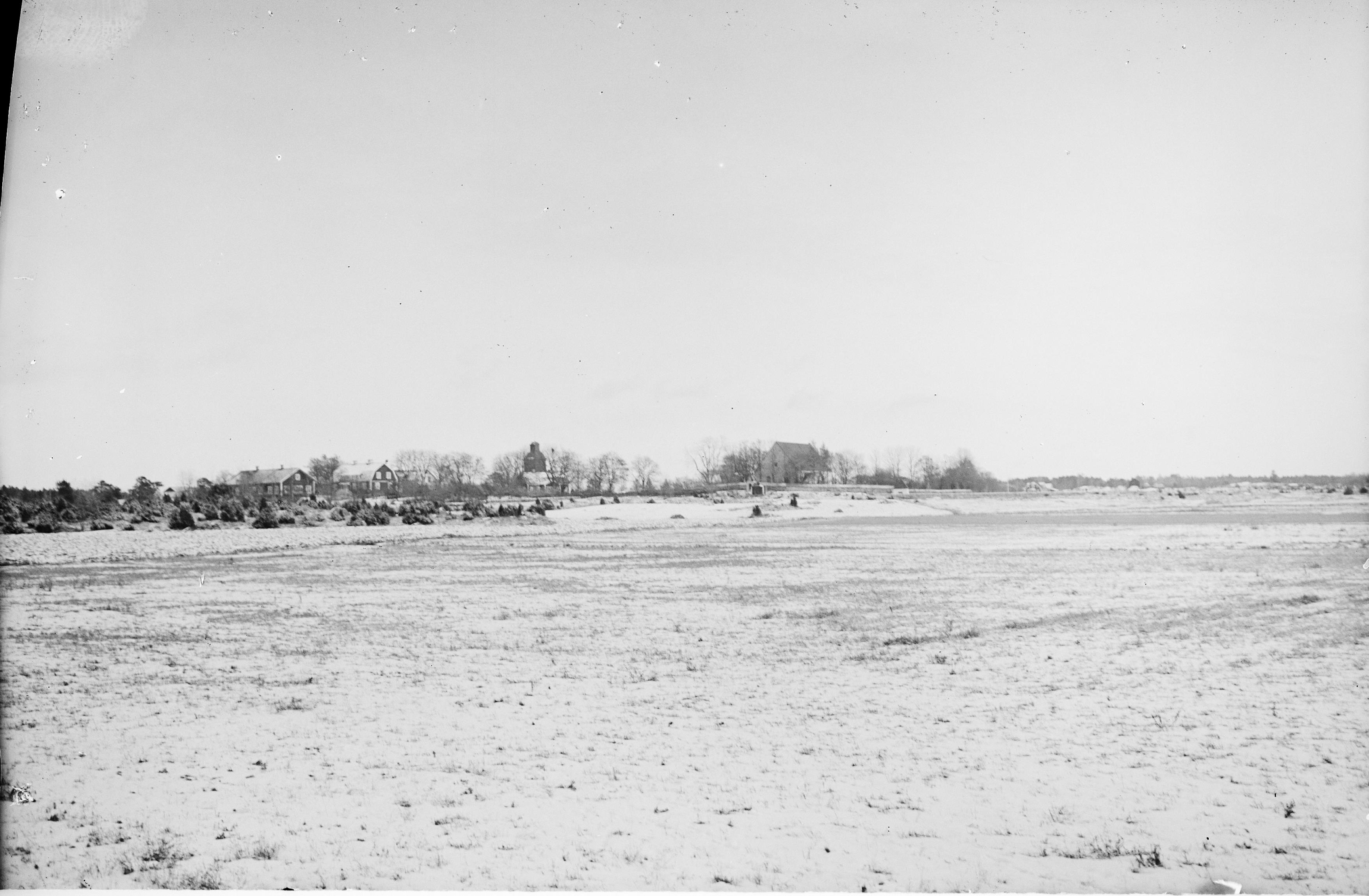 Kyrkan och klockstapeln mot sydväst. Landskapsvy.