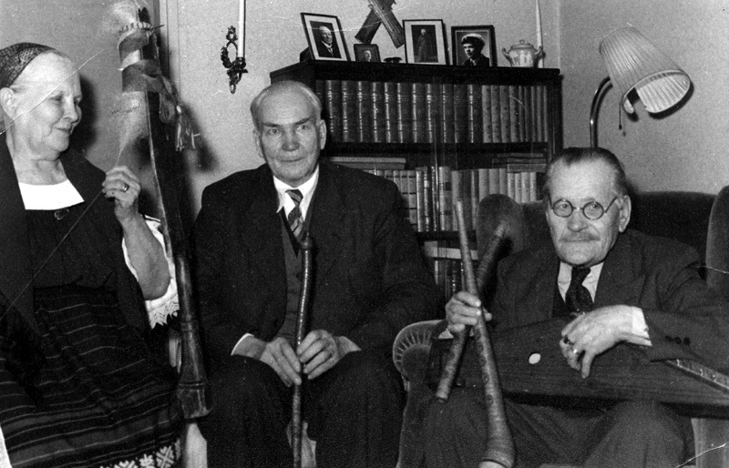 Från vänster: karelskan Elmi Tshokkinen, en av Finlands sista gråterskor och runosångerskor, spinnande på en "Värttina", Olov Olovsson från Velen och Finlands mest kände folkspeleman Peppo Repu, till börden ingermanländare med egenhändigt förfärdigade kantele och näverflöjter.