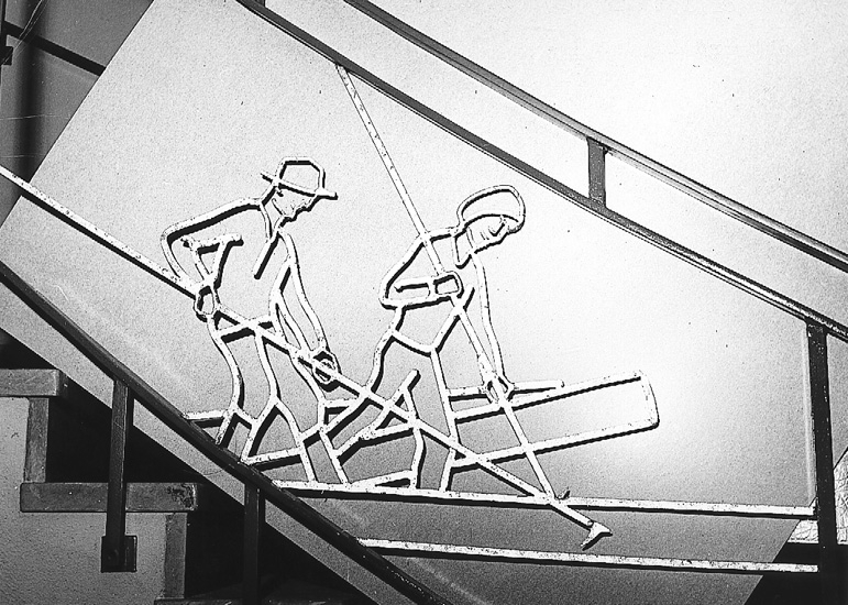 Två timmerflottare pryder trappräcket upp till andra vån. i Prostgårdslagårn.