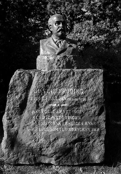 Minnesten med byst av Gustav Fröding. På stenen står texten " GUSTAV FRÖDING FÖDDES HÄR DEN 22 AUGUSTI 1860. HVAR GRAL ÄR VET INGEN MEN DJUPAST I TINGEN BO GNISTORNA HEMLIGEN KVAR AF LJUS SOM I LIFSDRYCKEN VAR"