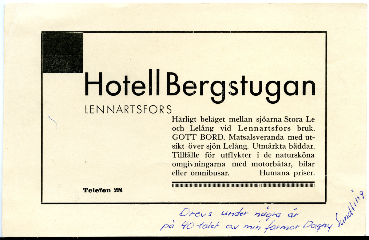 Annons för Bergstugan som drevs av Dagny Sundling.