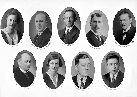 Seminaristernas Kamratalbum. År 1937. Sem.lär. Albert Sjöstrand. Sem.lär. Erik Frändin. Gymn.dir. Axel Törner. Sem.lär. Gustaf Karlström. Sem.lär. Ruth Lilius. Sem.lär. Erik Paulsson. Sem.lär.Karl-Eric Björkström. Slöjd.lär. Märtha Wåhlen. Skolläk. Arvid Högström.