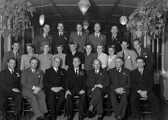 Större grupp män och kvinnor eventuellt vid kräftskiva; se lamporna.