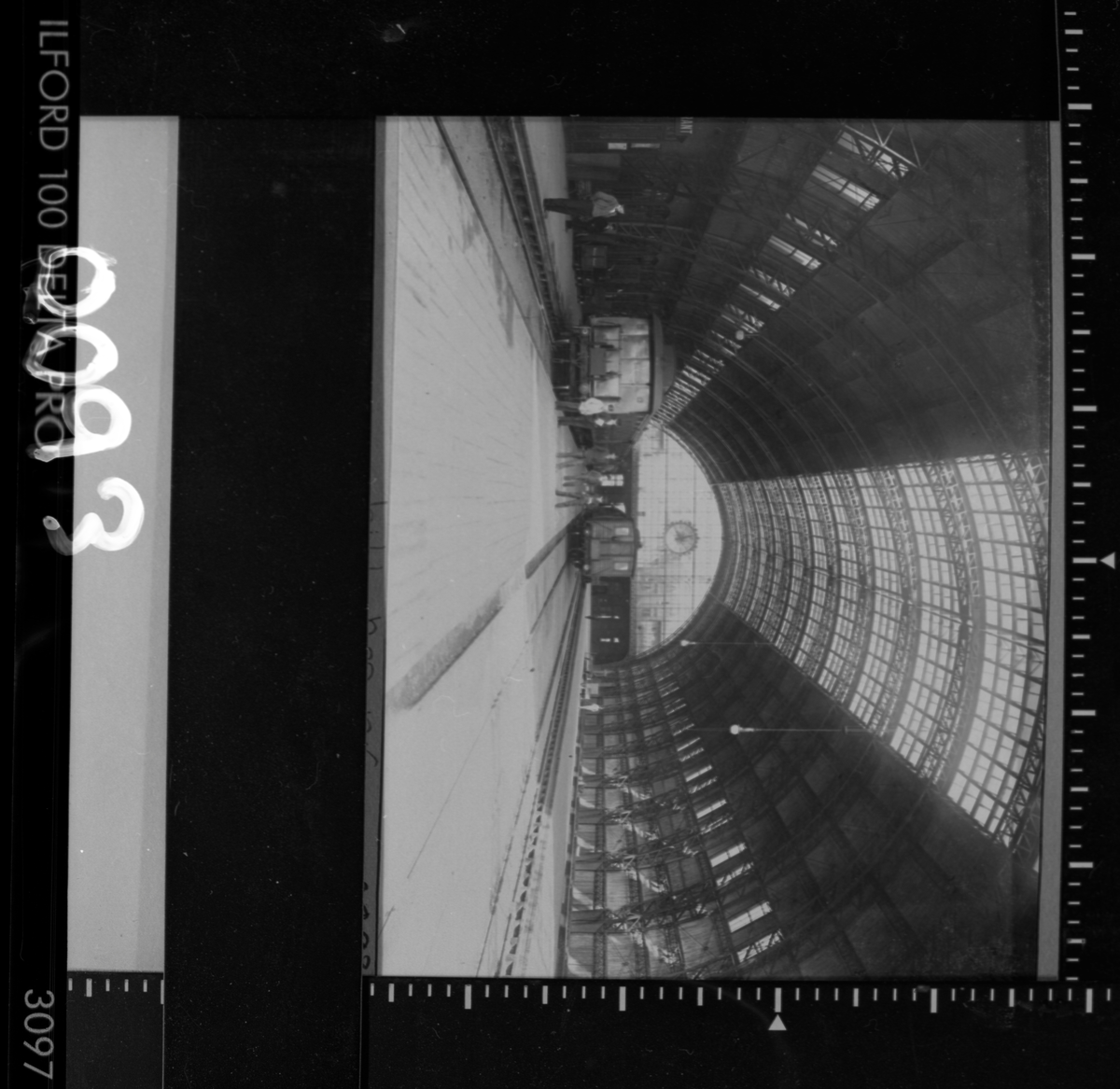 På kuvertet står följande information sammanställd vid museets första genomgång av materialet: Järnvägsstation, banhall.