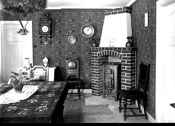Heminteriör med kamin, bord, stol och konstverk på väggen.