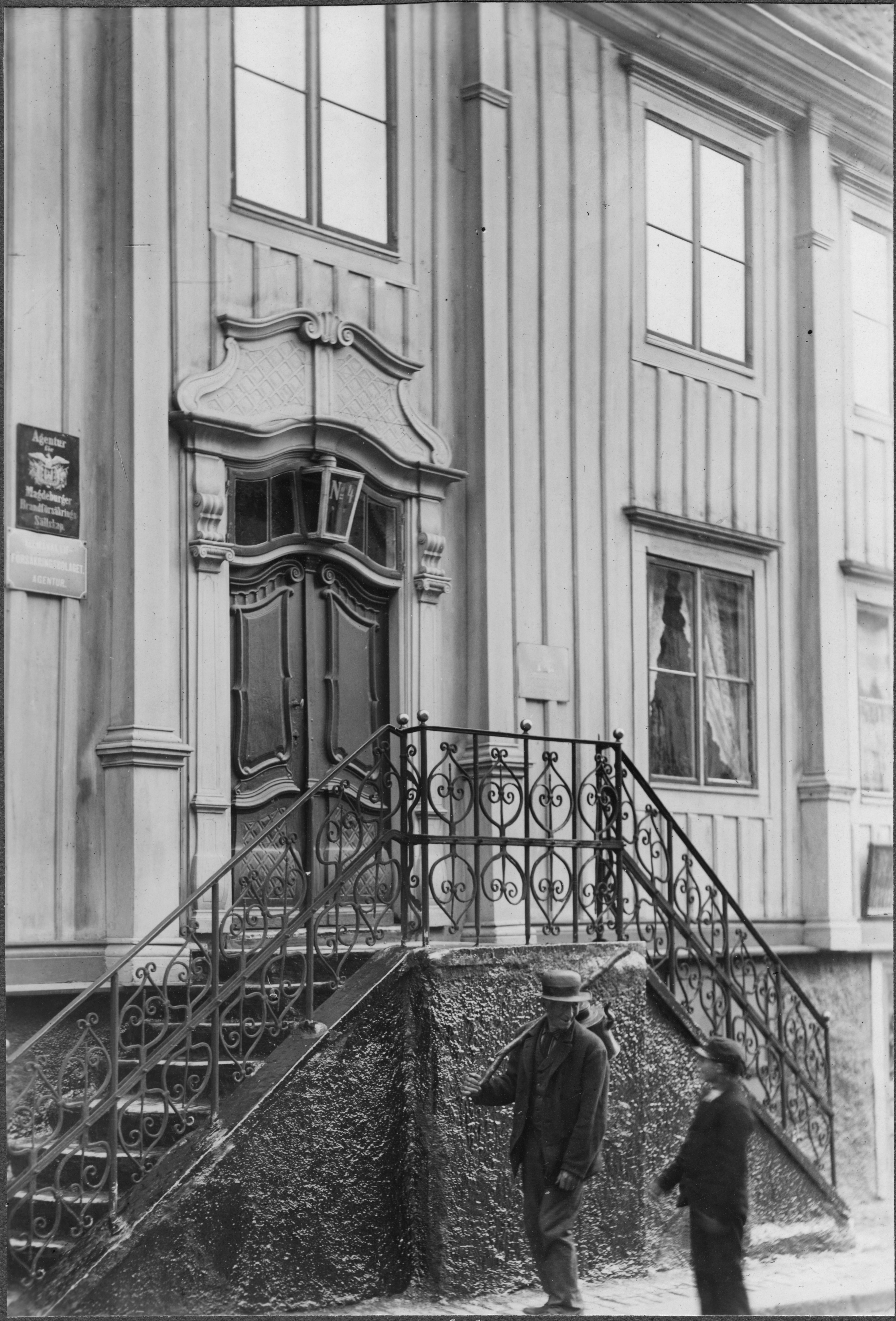Skottsbergska gården. Fasad med stentrappa mot Drottninggatan 91.
