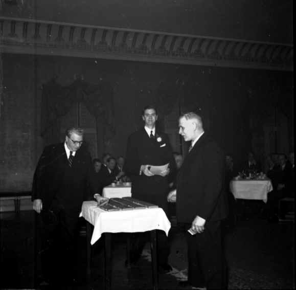 Tre män i förgrunden i festlokal. Förmodligen vid jubileum.