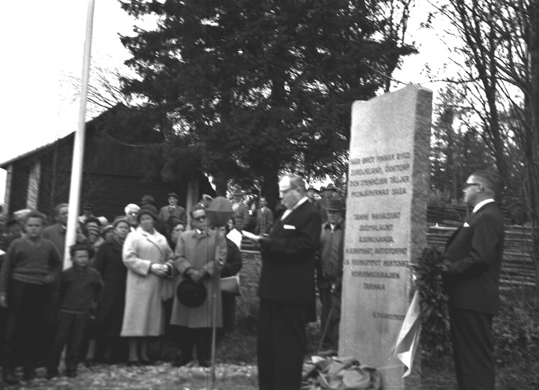 Finlands-Sveriges fadderortsförenings sekreterare Magister Lauri Merivirta talar vid avtäckning av finska invandrarnas sten på Kvarntorp