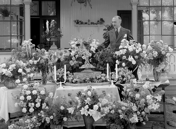 Man omgiven av blomsterarrangemang.