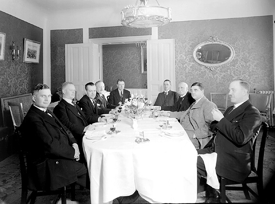 Uppklädda män vid dukat bord.
