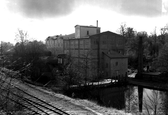 Större industribyggnad i sten, med järnväg i förgrunden.