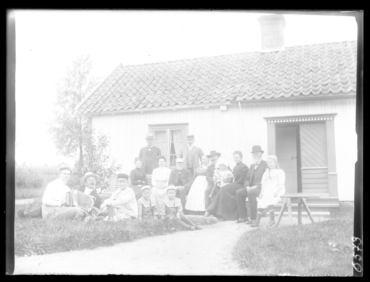 På kuvertet står följande information sammanställd vid museets första genomgång av materialet: Gr.bild taget framför stuga.