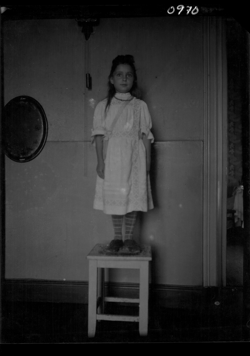 På kuvertet står följande information sammanställd vid museets första genomgång av materialet: Flicka på pall. Int