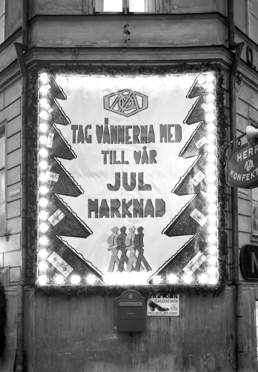 Affisch från N O Andersson & Co i hörnet av Drottninggatan och Östra Torggatan. Lägg märke till den mörka (röda) brevlådan. Den tillhörde Postiljohans företrädare, Karlstads lokalpost som var verksamma i stan i ett 10-tal år. Bilden från mitten av 1930-talet.