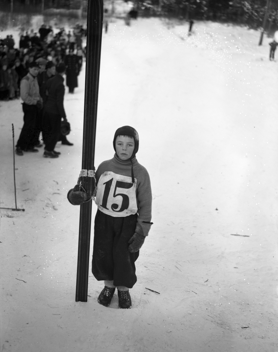 Rune Nilsson från Norrstrands IF. Dagens i särklass yngste deltagare vid en backhoppstävling år 1938. Backen låg vid Svinbäcksbergets branta avslutning mot norr.