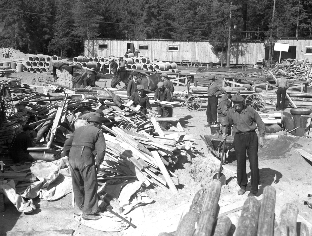 Byggarbetare på en bild från Svenska Rayons fabriksområde i Vålberg.