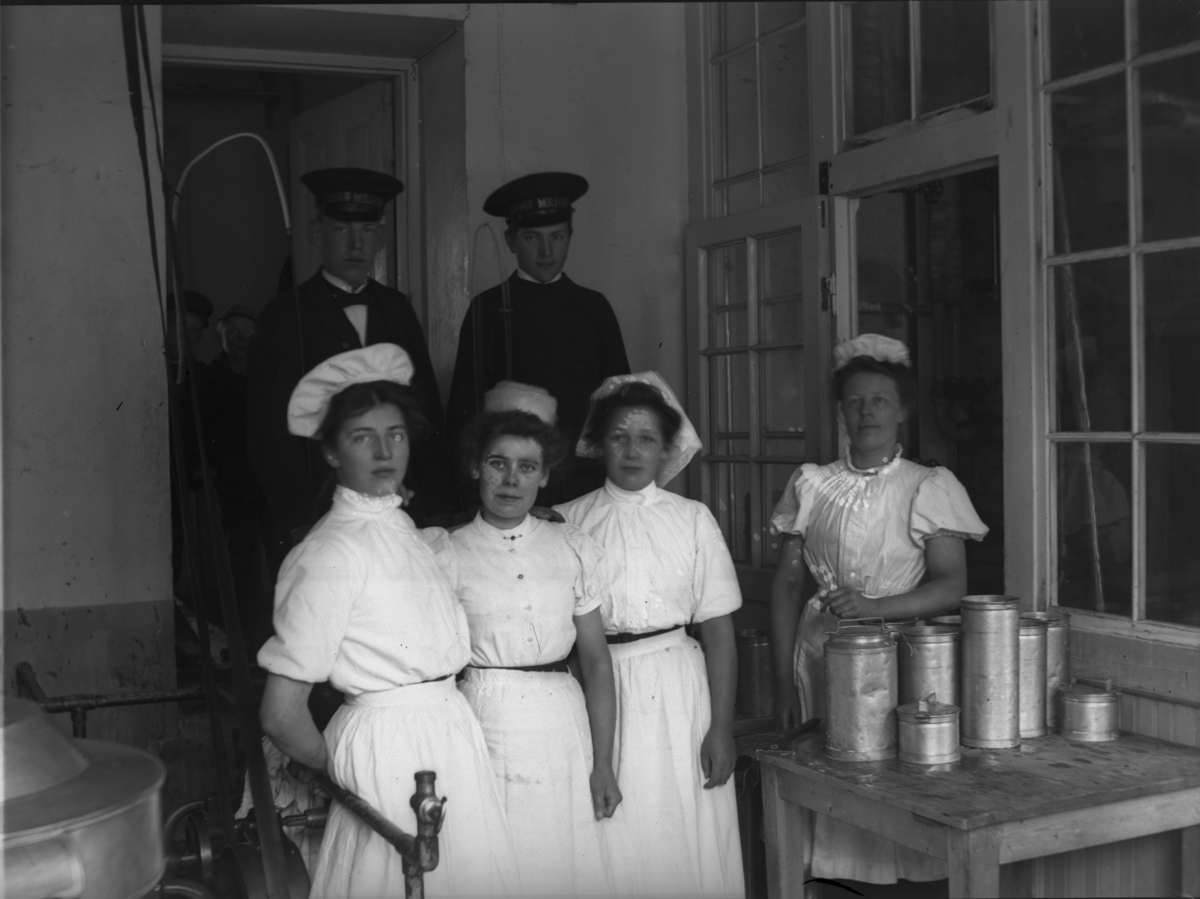 Bild tagen hos Långs mejeri som låg i den ännu kvarstående fastigheten på Östra Torggatan 18 i början på förra seklet. Skadat original.