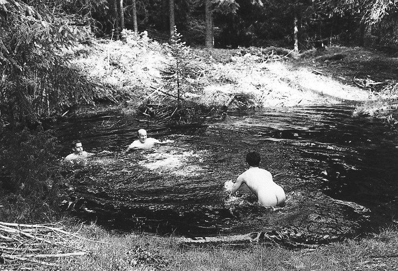 Efter finnbastubadet på Karmenkynna svalkar man av sig i den närliggande kvarndammen.