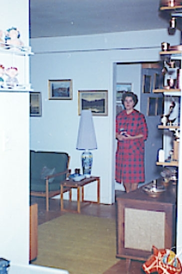Västkustmotiv. Tjärn i Värmland 1955-60. Gunnar Bohlin. Bakom motiv från någonstans i Sverige. Vardagsrum med hall till sovrummet.