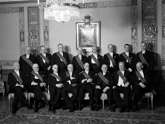 Män i högtidsdräkt och ordensband på frimurarlogen.
