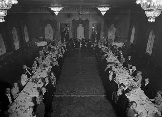 Män och kvinnor vid dukade långbord.