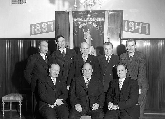 Män i kostym vid firande av Karlstads Bleck & Plåtslagareförenings 50 års jubileum.