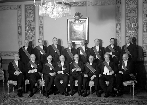 Män i högtidsdräkt och ordensband på frimurarlogen.