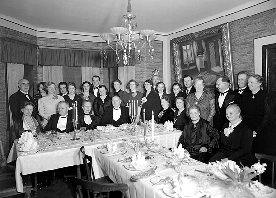 Titel: En större samling män, kvinnor och barn vid dukat bord.