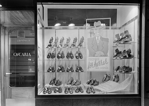 Skor, samt reklam i skyltfönster tillhörande Oscaria.