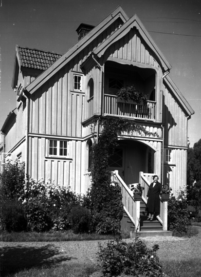 Kvinna på trapp till tvåvåningshus.