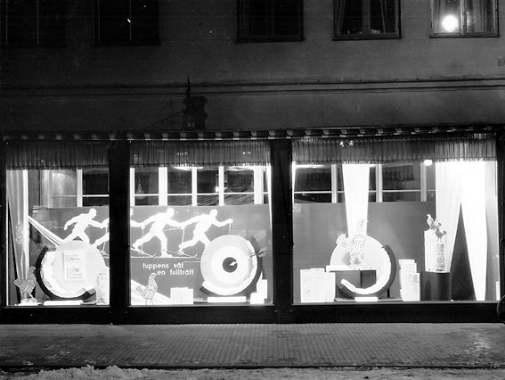 Titel: Bild tagen på kvällen i skyltfönstren hos Ekelöf & Svensson AB. 1872 etablerade fröknarna Hilda Ekelöf och Carolina Svensson en detaljaffär i manufaktur. Vacklande hälsa gjorde att firman 1897 överläts till Wilh. Welin som skapade nya avdelningar, till exempel flaggtillverkningen (1900) och en syatelje för klänningar (1905) samt en modeaffär (1914) där bland annat Josefin Baker gick modell. Sommaren 1999 lades verksamheten ner på grund av olönsamhet. Källa: Nyblom-Svanqvist, Näringsliv i Värmland, 1945 och Värmlands Folkblad.