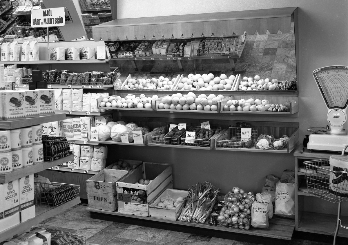 Bildsvit från Frits Thybergs speceriaffär på Kvarnberget, kanske ett av Karlstads första snabbköp. Butiken fanns på Jössegatan 7 där ett politiskt parti nu är hyresgäst. Bilden tagen år 1951.