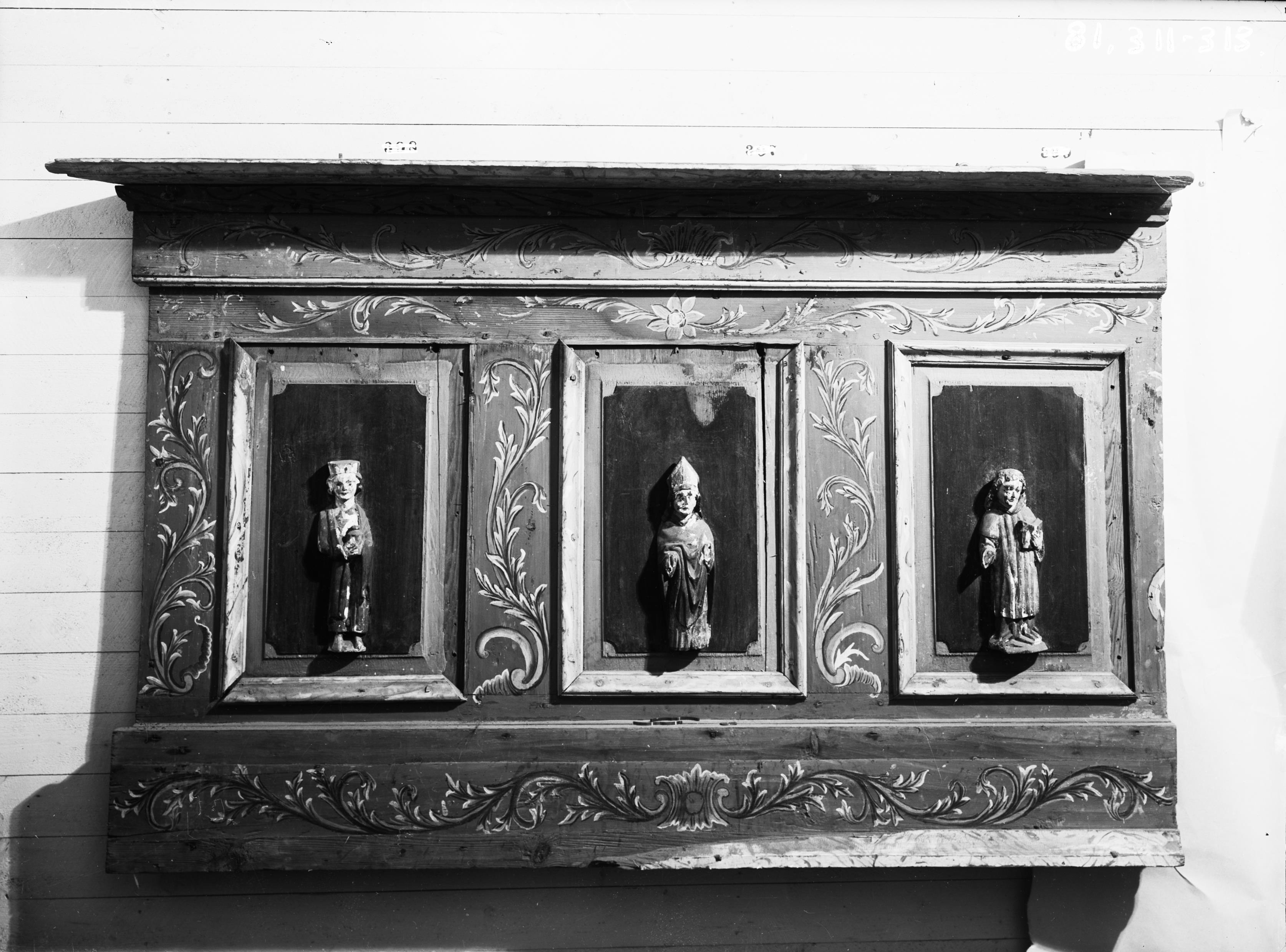 Del av äldre läktarbröstning, tre speglar med varsin skulpterad medeltida helgonfigur i mitten.