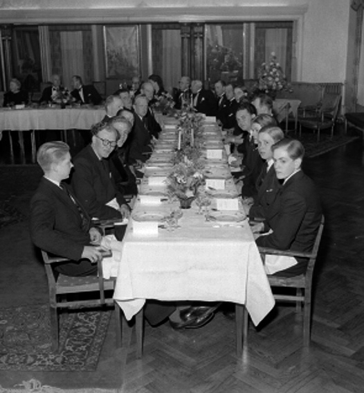 Män och kvinnor vid dukat långbord.