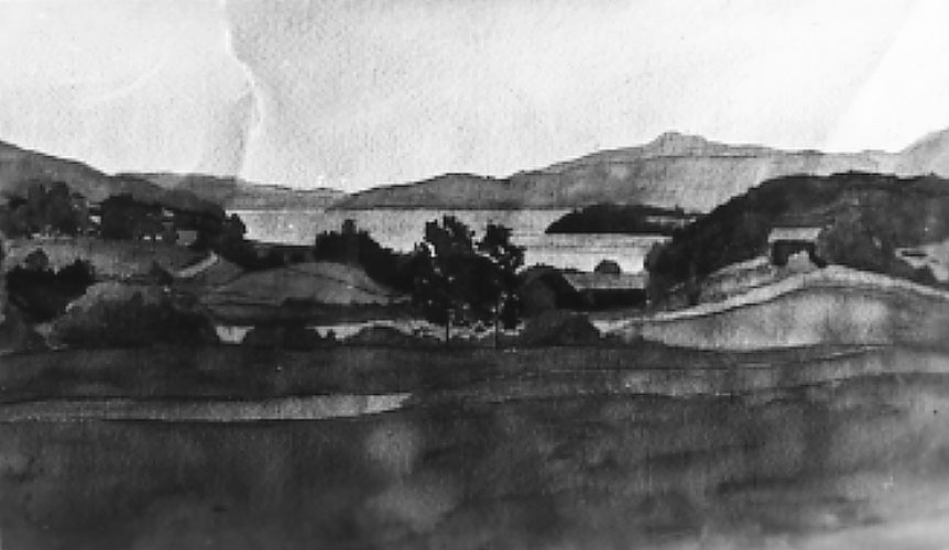 Tossebergsklätten sedd från nordost. Efter målning av Ebba Frykholm.