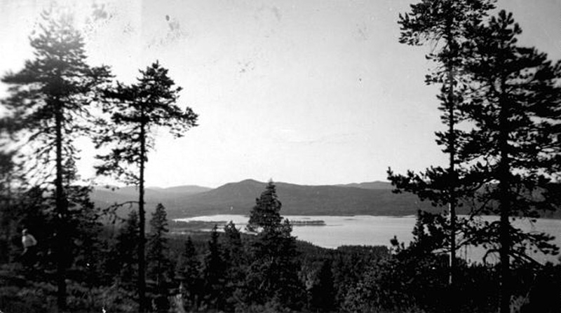 Vy från Bograngsbergets topp (494 m.ö.h) över sjön Letten efter dess uppdämning. Avundsåsberget i fonden 621 m.ö.h.