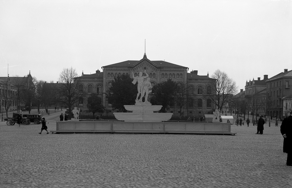 Professor Carl Eldh visar upp en modell till statygrupp på torget. Bilden tagen 1930.