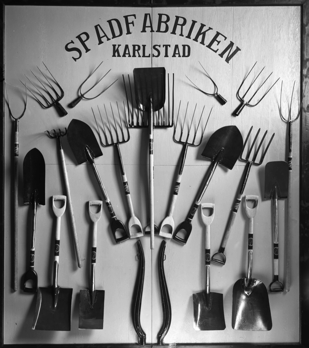 Produkter från spadfabriken i Karlstad. Foto Dan Gunner. år 1936