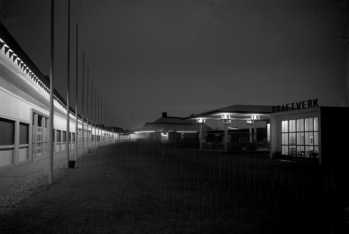 Bild från Vermlandsutställningen i Klara 1929. Nattbild från Värmlandsvägen. Bilden är fläckig.