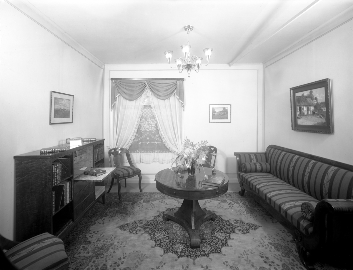 Visningsrum för Gullstrands möbler. Företaget låg i östra hörnet av KungsgatanÖstra Torggatan.