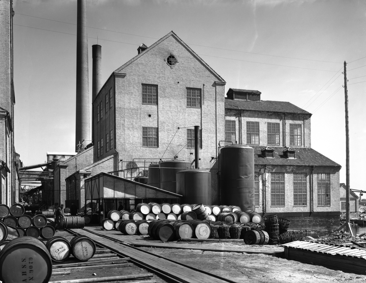 Skoghallsverkens spritfabrik med den färdiga produkten lagd på fat.