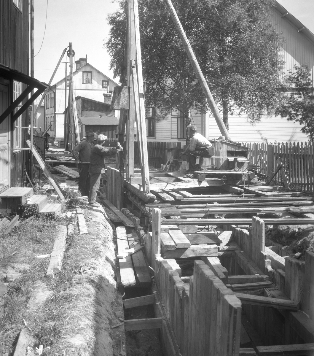 Bygge av pumpstation och avloppsledningar i Hagaborgsområdet. Bilden tagen 1933.