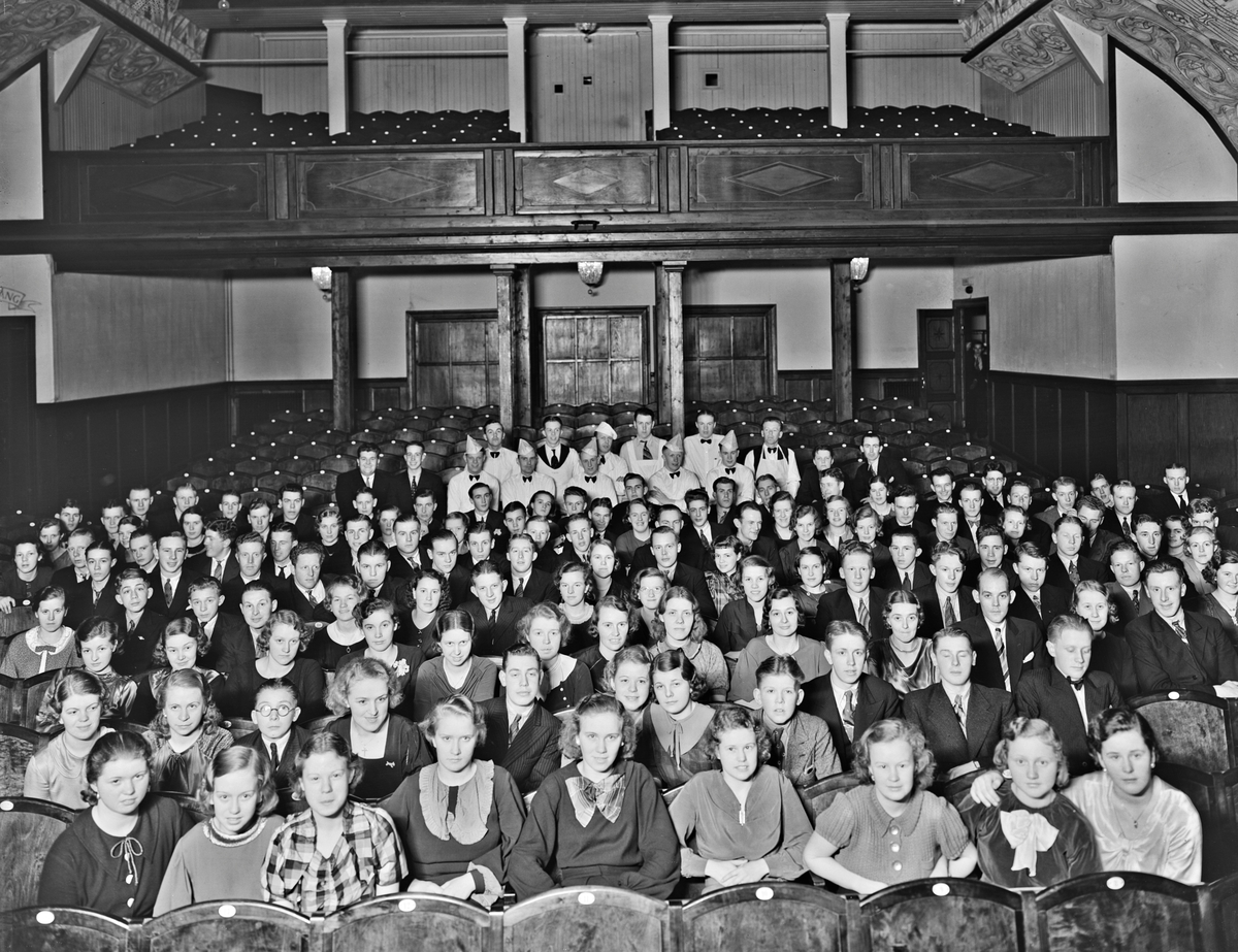 Den socialdemokratiska ungdomsklubben "brödernas afton" i Skoghall den 19 mars 1936, samlade i Folkets hus A-sal. Fotot beställt av herr Lander.