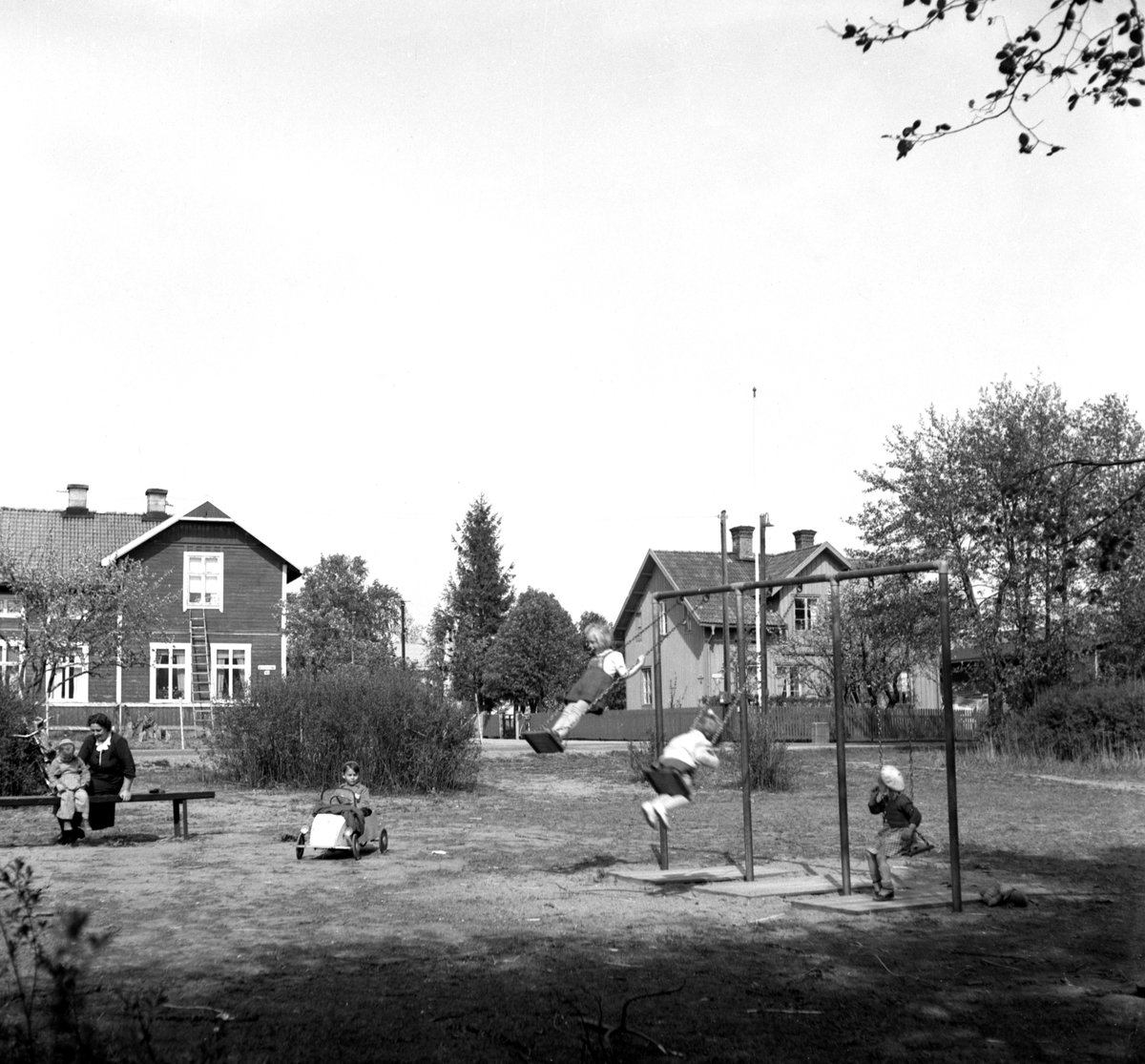 Bild tagen en majdag i Karlstad året 1949. Bortom lekplatsen syns korsningen mellan dåvarande Sjöstadsvägen o Frejgatan.