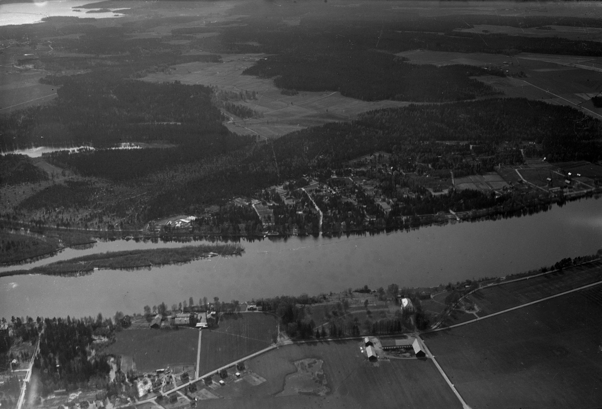 Vy från öster över södra Råtorp 1935. På bilden syns även herrgården och bryggeriet på Färjestad.