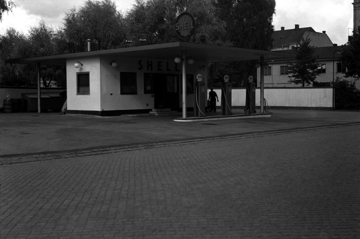 Shells bensinstation i Klara i nuvarande Malmtorgsparken. Bilden tagen 1945.