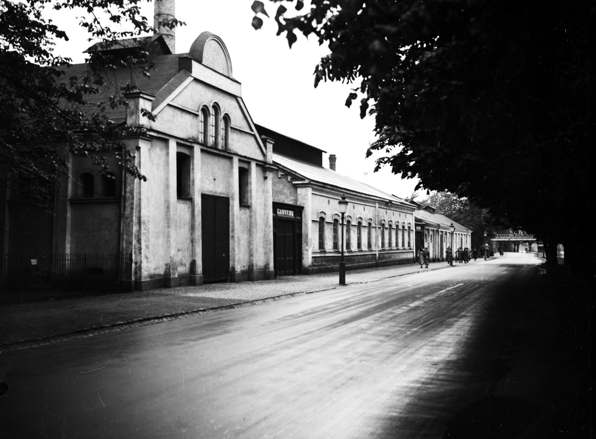 Gamla gasverkets byggnader längs Älvgatan med järnvägsviadukten till höger i bakgrunden. Bilden från 1938.