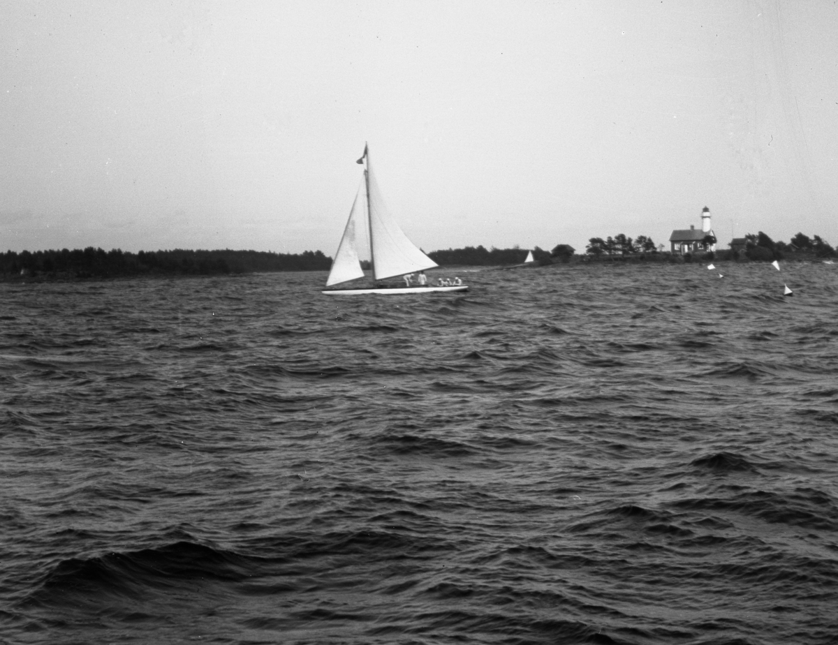 Söökojans fyr och segelbåt på bild tagen runt förra sekelskiftet.