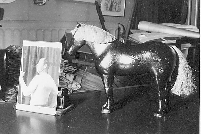 Föremål som tillhört kraftatleten Lars Henriksson "Tass-Lars", f 1871 i Tassmyra, Östmark. Hans foto på bordet. Han snidade trähästar.